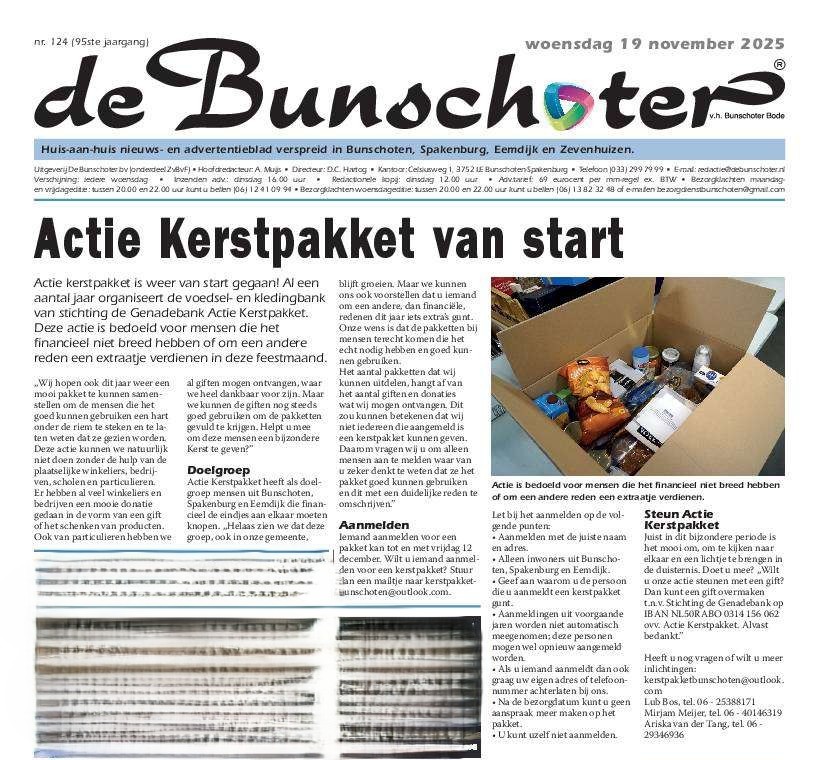 Jaarlijks deelt De Genadebank, ongeveer 150 kerstpakketten uit aan de minderbedeelden in Bunschoten-Spakenburg. Hiermee willen wij deze mensen een hart onder de riem steken en laten weten dat ze juist in de maand die bekend staat als de “feestmaand” gezien worden. Zo wordt het voor hun ook een feestmaand! Wij kunnen deze actie niet organiseren zonder de steun van de ondernemers uit ons dorp. Daarom brengen wij ook dit jaar deze actie weer onder uw aandacht. We hopen dat u deze actie wilt steunen door middel van het doneren van een financiële gift. De waarde van het kerstpakket wat wij jaarlijks geven bedraagt € 40,- Lijkt het u leuk om een 1 of meerdere kerstpakketten te doneren door een financiële gift.